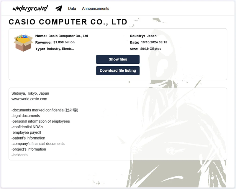 卡西欧数据在Underground勒索软件门户网站上泄露