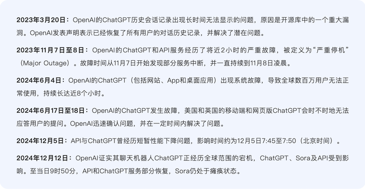 自OpenAI服务推出以来,ChatGPT虽然也经历了几次P0级别(最严重的事故级别)宕机事故,但总体来说,它相对可靠,已然在创新和稳定性之间找到平衡,并逐步成为类似传统云服务的关键组成部分。