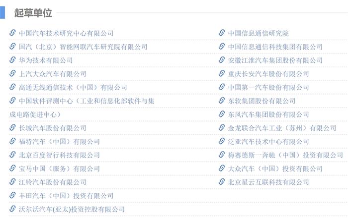 该标准主要起草单位包括中国信通院、华为、中国信科、高通、大众、长城、福特、百度、宝马、丰田、沃尔沃、长安、东风、梅赛德斯等。
