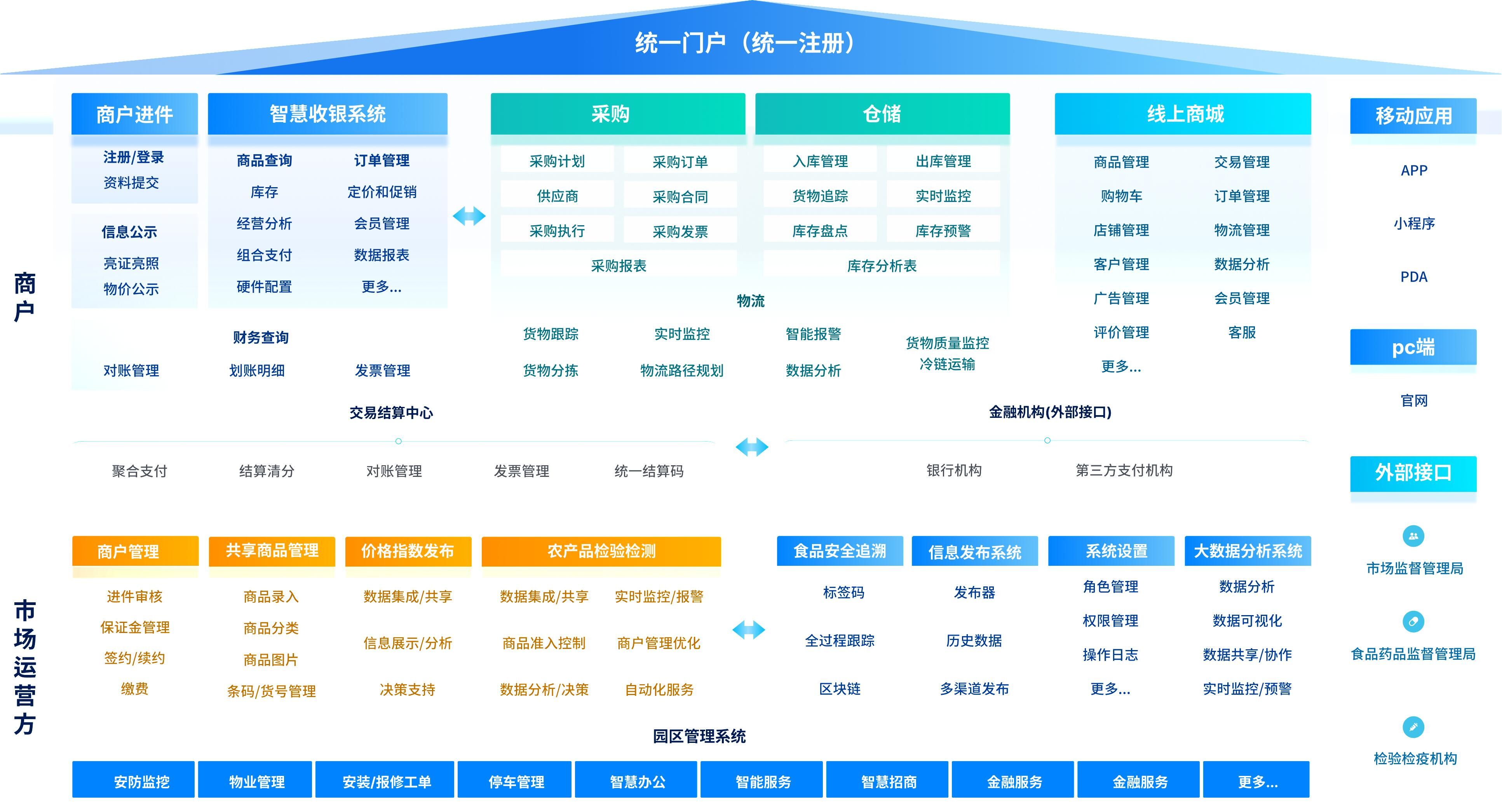 商户与采购商双端服务模块:为商户提供在线缴费、经营报表查询等服务;为采购商提供线上询价、下单、配送等功能。
