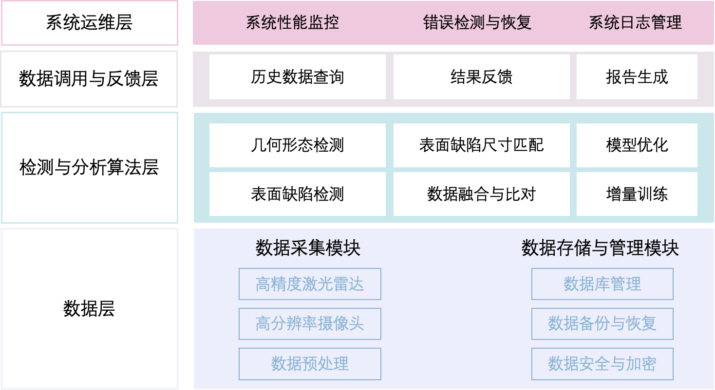 系统采用四层架构(数据层、检测分析算法层、数据调用反馈层、系统运维层),技术栈涵盖Vue3、SpringBoot等,划分三个微服务。数据层负责采集存储激光雷达与图像数据并预处理,算法层通过多算法检测几何形变与表面缺陷,反馈层提供数据查询与结果反馈,运维层保障系统稳定运行。