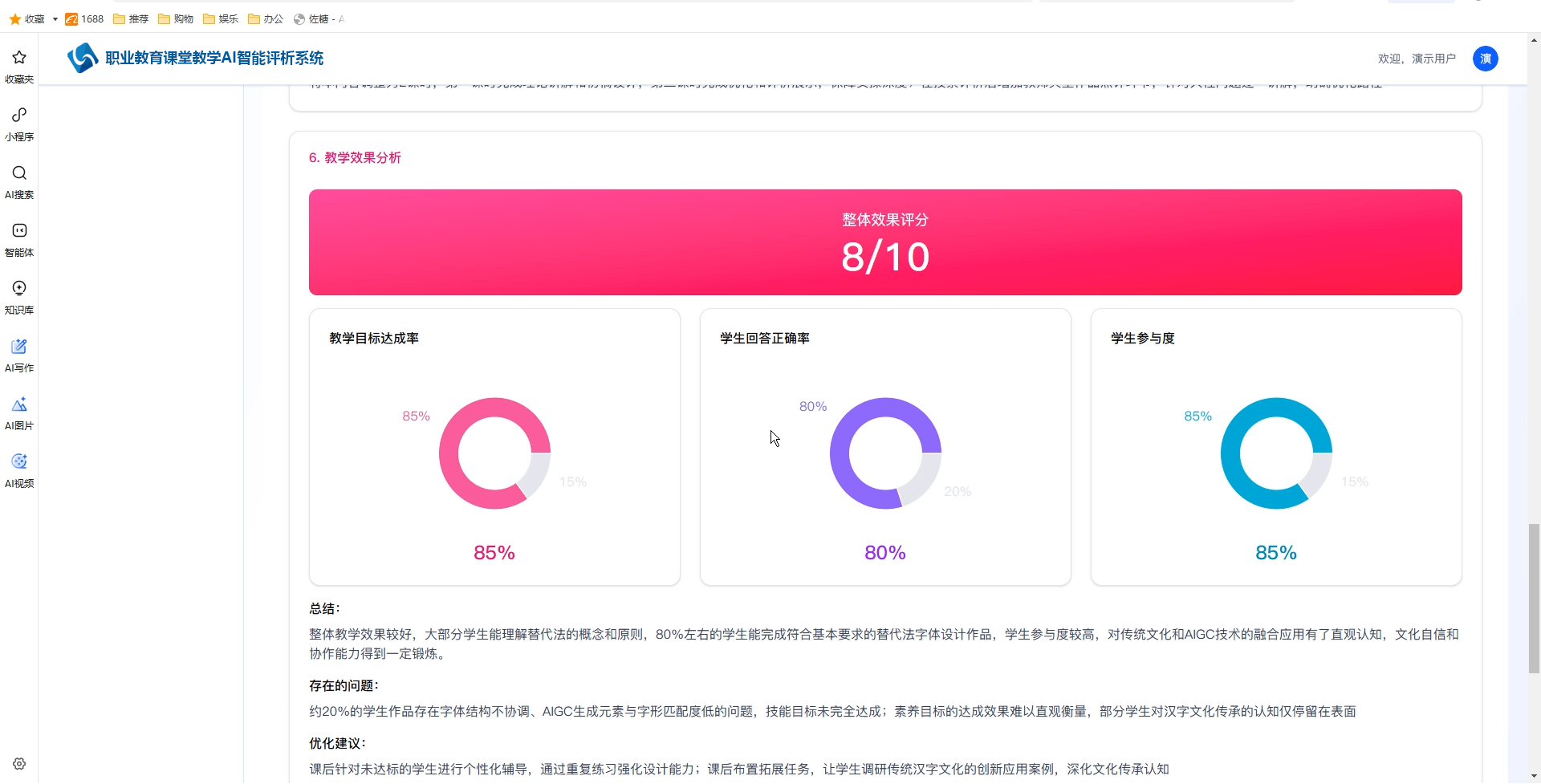 为促进报告后的深度反思与持续学习,系统内置了智能教研问答助手。教师可针对报告中的任何疑点或自身教学设计的想法,以自然语言提问,助手将基于教育学理论、职业教育教学法最佳实践及学院本地的优秀教学案例库,将一次性的课后评价延伸为持续的、个性化的专业发展对话与资源支持服务。