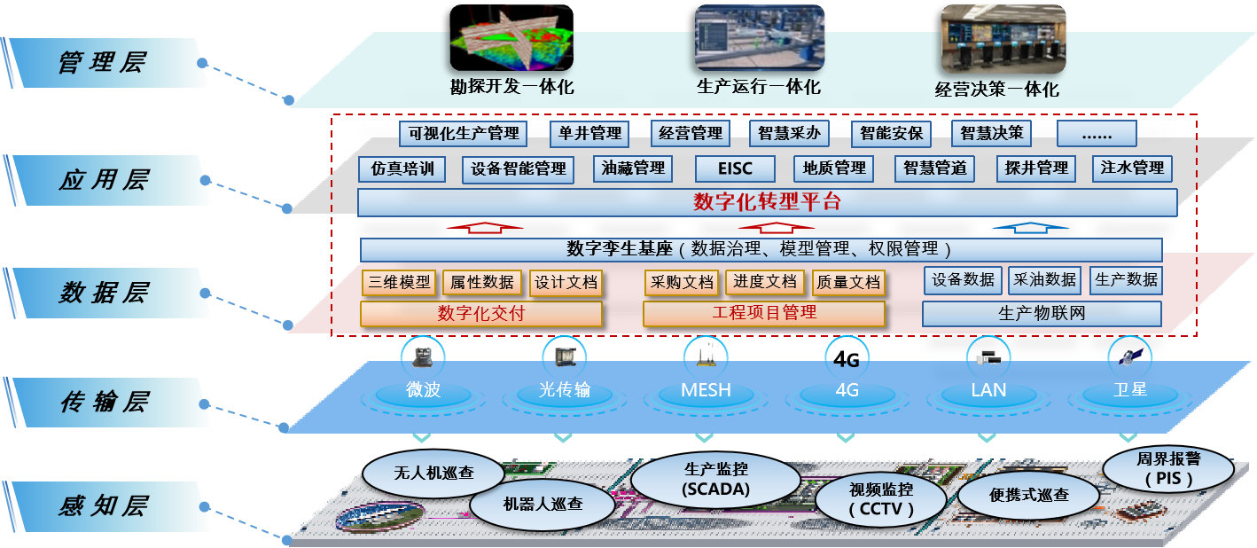 以数字化交付的三维模型、属性数据,工程项目管理的文档数据为基础,与生产物联网数据相结合,支撑数字孪生基座创建虚拟现实环境,形成数字化转型平台2.0。以此为基础再进行业务场景建设,打破数据孤岛、避免重复开发,从而有效实现勘探开发、生产运行、经营决策的数字化转型,智能化发展。