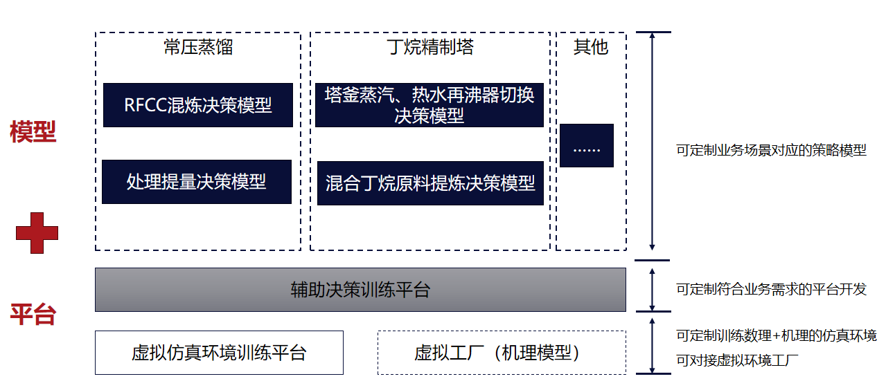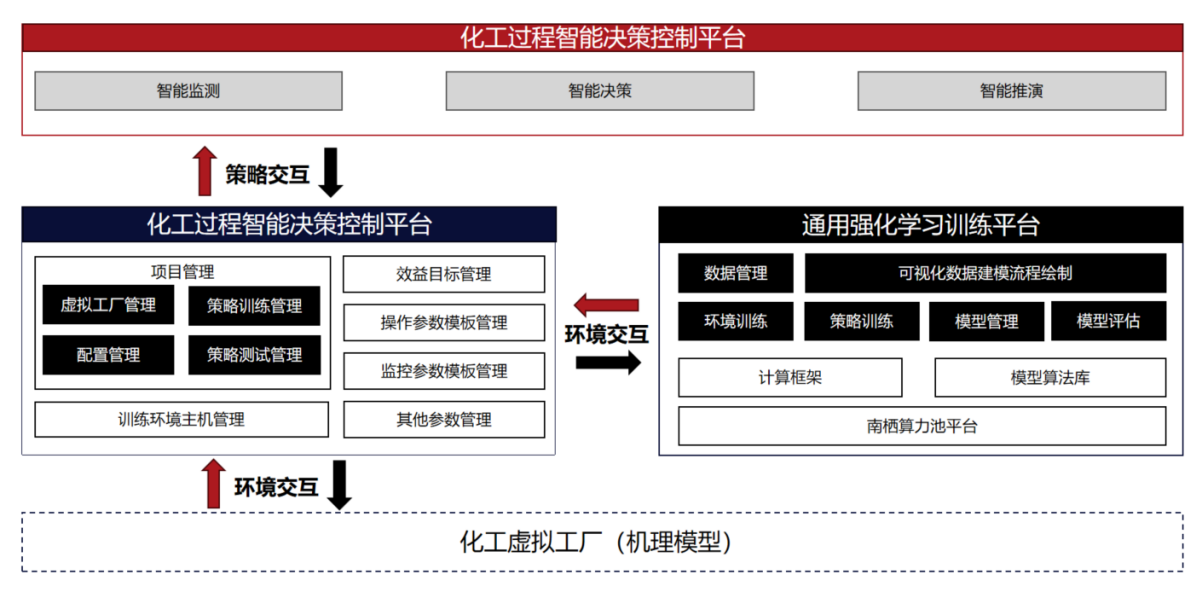 包括化工过程智能决策控制平台、基础研发的通用强化学习训练平台POLIXIR REVIVE。通过决策控制平台与强化学习训练平台、基于机理的第三方虚拟工厂进行环境交互,训练出策略模型,并与实际控制进行策略交互,最终做到智能决策和智能推演