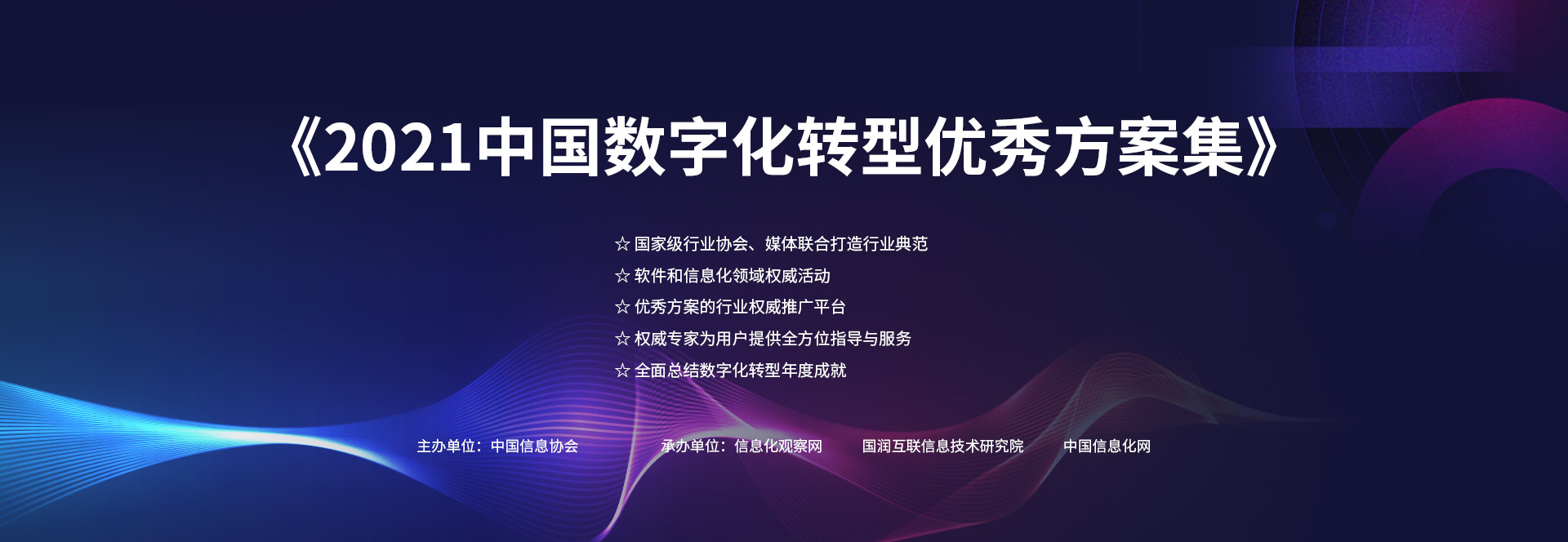 为深入实施“十四五”创新驱动发展战略,推动优秀创新成果和前沿科技落地转化,中国信息协会将联合信息化观察网从技术先进性、创新性、适用性、可行性、成熟度,以及取得的经济效益、社会效益和推广价值等出发,遴选符合行业发展方向的突出建设成就与优秀服务案例,并汇编成《2021中国数字化转型优秀方案集》(简称“方案集”)。通过整合集聚优势创新资源,归纳出面向未来、立足成长的数字化转型模型,以期提升产业创新能力和企业核心竞争力,促进先进技术产品规模化推广应用,为数字经济发展增添新活力、注入新动能。